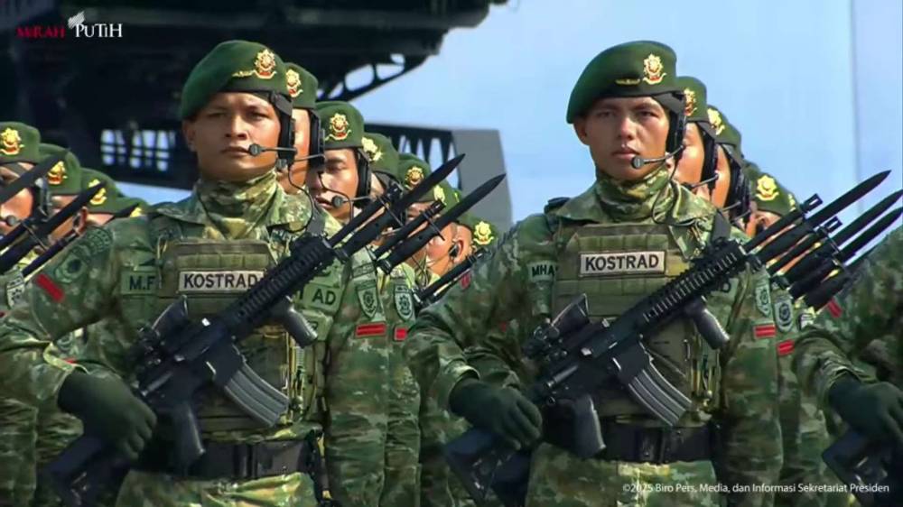 Prajurit TNI AD dari Komando Cadangan Strategis Angkatan Darat (Kostrad) menggunakan seragam tempur (PDL TNI) yang baru mengikuti upacara peringatan Hari Ulang Tahun ke-80 TNI dengan di kawasan Monas, Jakarta, Minggu (5/10/2025)