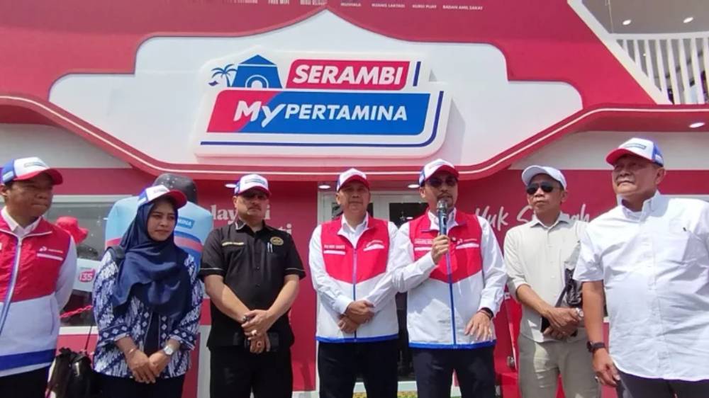 Dirut Pertamina Patra Niaga, Mars Ego Legowo Putra didampingi sejumlah pimpinan PT Pertamina Patra Niaga dan pemerhati sektor energi, Ferdinand Hutahaenan ketika memberi keterangan mengenai keuntungan layanan Serambi My Pertamina, di Rest Area KM 57 Tol Cikampek, pada Senin 16 Maret 2026.